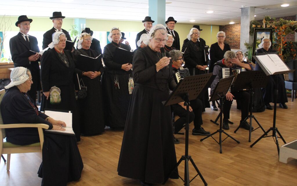 Na de ontvangst met koffie en thee zat de stemming er meteen goed in dankzij de vrolijke jonge medewerker die ons introduceerde. Hij riep het publiek op tot een welkomst-applaus voor onze mooie uitstraling. Dat voelde goed voor ons en blij begonnen we aan onze liedjes voor deze dag. We zongen o.a. De orgelman, Marina, Zuiderzeeballade, De edelweiss staat weer in bloei en Dans nog eenmaal met mij met Petera en John als danspaar. De mannen zongen Vissers van toen en Westzuidwest van Ameland. Magda zong solo het mooie lied Het Winkeltje.
