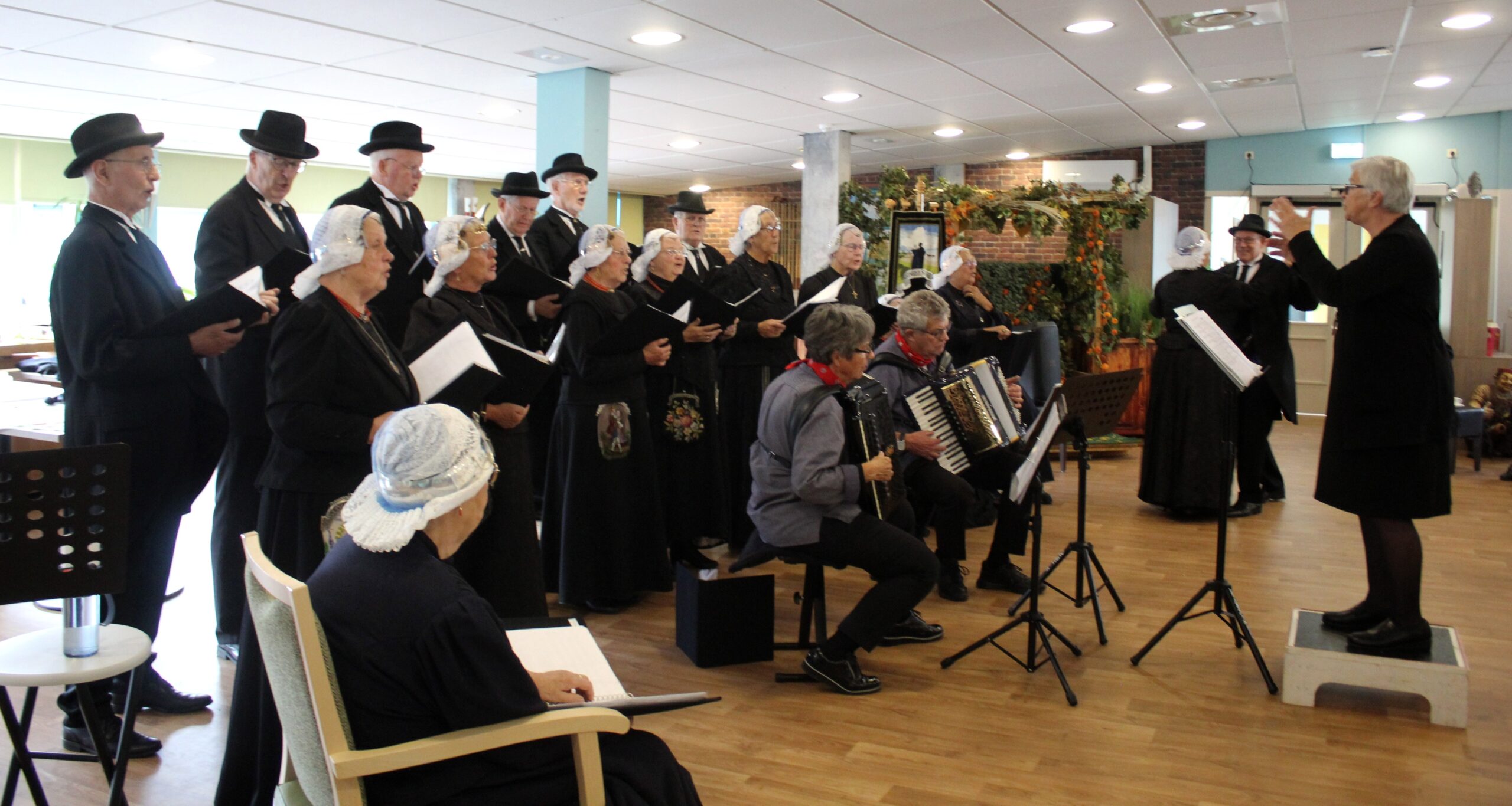 Na de ontvangst met koffie en thee zat de stemming er meteen goed in dankzij de vrolijke jonge medewerker die ons introduceerde. Hij riep het publiek op tot een welkomst-applaus voor onze mooie uitstraling. Dat voelde goed voor ons en blij begonnen we aan onze liedjes voor deze dag. We zongen o.a. De orgelman, Marina, Zuiderzeeballade, De edelweiss staat weer in bloei en Dans nog eenmaal met mij met Petera en John als danspaar. De mannen zongen Vissers van toen en Westzuidwest van Ameland. Magda zong solo het mooie lied Het Winkeltje.